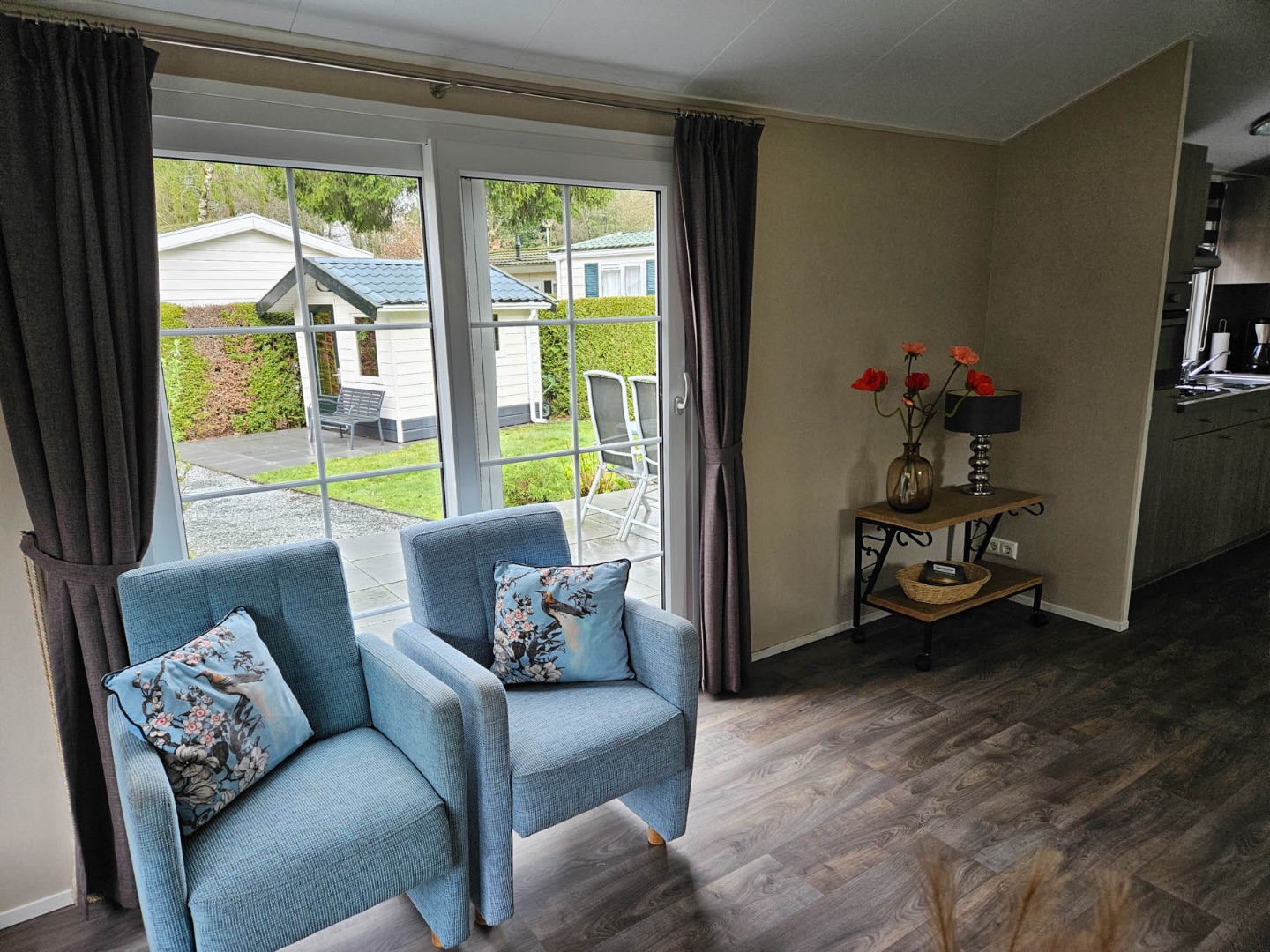 Chalet v.v. woonkamer met open keuken, gasfornuis, koelkast met vriesvak en combi-oven, ruime woonkamer. Woonkamer met schuifpui naar het terras en een flatscreen TV.